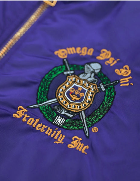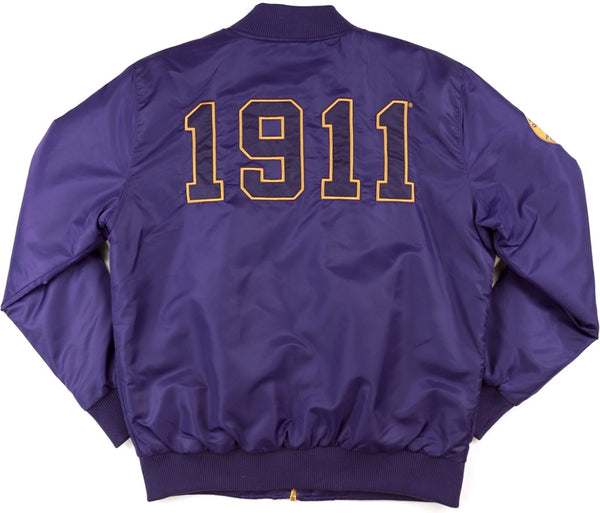 Our Standard Fit Bomber Jacket is lightweight, comfortable, and perfect to wear in cold weathers. The outer shell is waterproof and the inside has a gold 100% satin polyester lining to keep the cold out. The jacket features a full length front zip closure, two front slash pockets with flap & snap closure, a zippered utility pocket, an interior slip pocket, rib-knitted cuff, collar, and hem. Complete with embroidered patches on both sleeves, chest, and back.