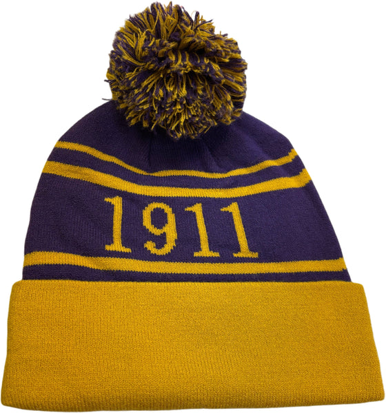 100% acrylic, one size fits all. The gold cap features designs on both the front and back, with an embroidered shield and Greek letters on one side and the founding year on the other.