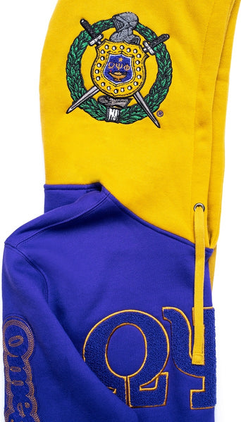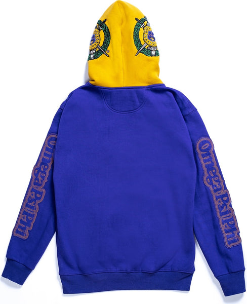 Embroidery "OMEGA PSI PHI" patch on both sleeves.
