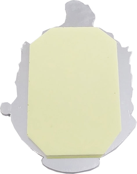 Die cut car badge with adhesive backing.