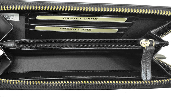 Soft leather wallet, enhanced with deep embossing and signature letter medallion along with matching signature zipper pull. Inside features include: 1 Slide Pocket, 2 Bill Compartments, 1 zippered Coin Compartment, and 4 Credit Card Slots. Wallet measures 6 3/4" by 3 3/4" by 1".