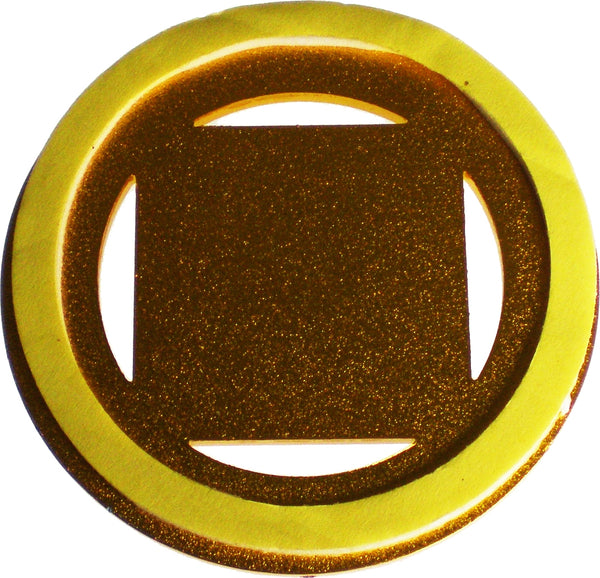 It is 2.75" in diameter and is made of a heavy weight zinc metal with a strong peel and stick backing.