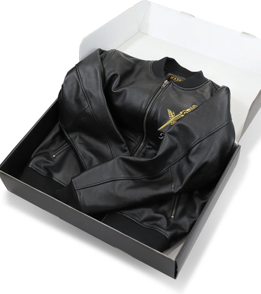 The jackets are made with 100% genuine leather and every jacket features a full length front zip closure, two front slash zip pockets, an interior slip pocket, rib-knitted cuff, collar, & hem. Complete with an interior Mason back patch and limited-edition number patch. Finished with embroidered Mason emblem patches on the outer chest & back to show their pride and dedication.