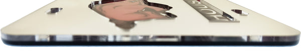 This House Divided Tag is made with a hard acrylic plastic base and a tough top layer of 2 split, mirrored acrylic pieces in contrasting colors, showcasing two collegiate schools. An additional cutout domed acrylic piece with the wording, "House Divided," is displayed on the plate as well. There are 2 holes at the top and 2 holes at the bottom of the license plate for screws.
