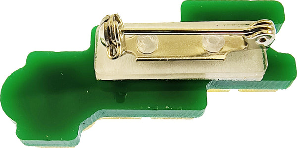 This Greek Pin is made out of mirrored acrylic plastic that is cut into Greek letters from each organization, and is attached to a latching metal safety pin. The size of the pin is about 1.125 inches by 0.5 inches.