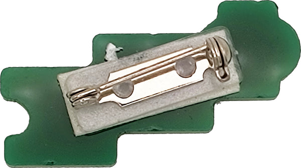 This Greek Pin is made out of a Colored acrylic plastic that is cut into Greek letters from each organization, and is attached to a latching metal safety pin. The size of the pin is about 1.125 inches by 0.5 inches.