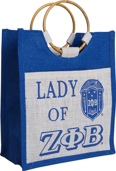 Pocket Jute Bag with Lady of Signature. 14" w x 18" h x 5" d.